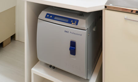 当院で使用している滅菌器「DACプロフェッショナル」は、日本の規格よりも厳しいヨーロッパの規格基準クラスB規格をクリアした滅菌器です。治療に使用する器具を徹底的に滅菌することで患者さんへの細菌感染の危険性を大幅に低減させ、安心・安全な歯科医療をご提供出来るよう心掛けています。